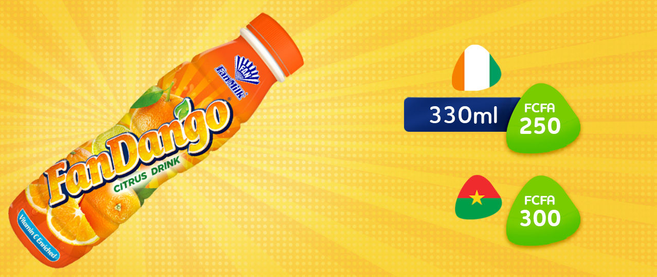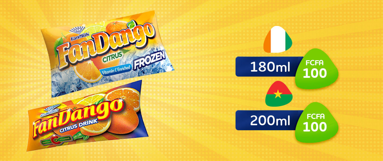 La sachet Fandango est congelée et est disponible en arôme d’agrumes. Il est offert en format de 170 ml au prix de 100 FCFA. Sa durée de conservation est de 6 mois.