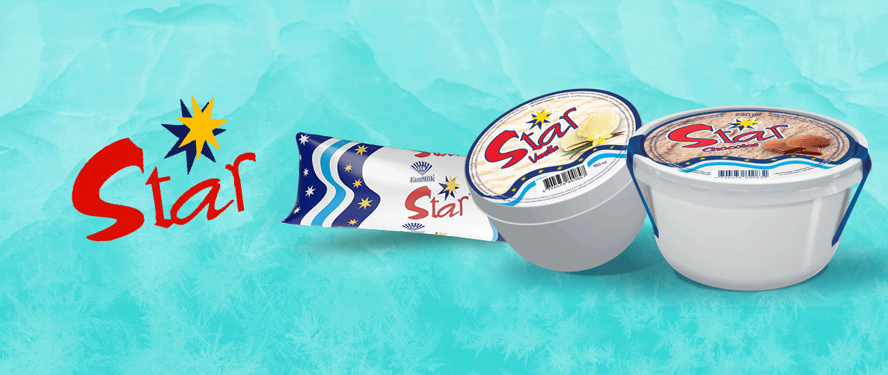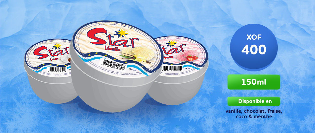 Star est une délicieuse crème glacée onctueuse et crémeuse. Elle est disponible en 3 saveurs excitantes : vanille, fraise et chocolat. Elle est livré dans un sachet de 85 ml et au prix 100 FCFA. Elle a une durée de conservation de 1 an.