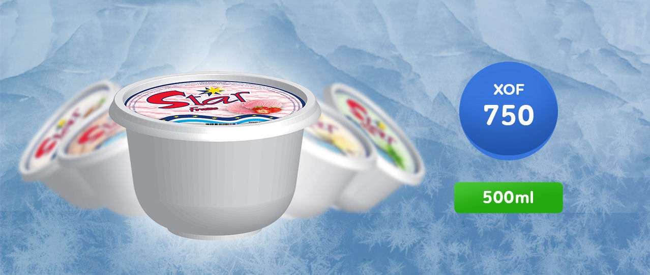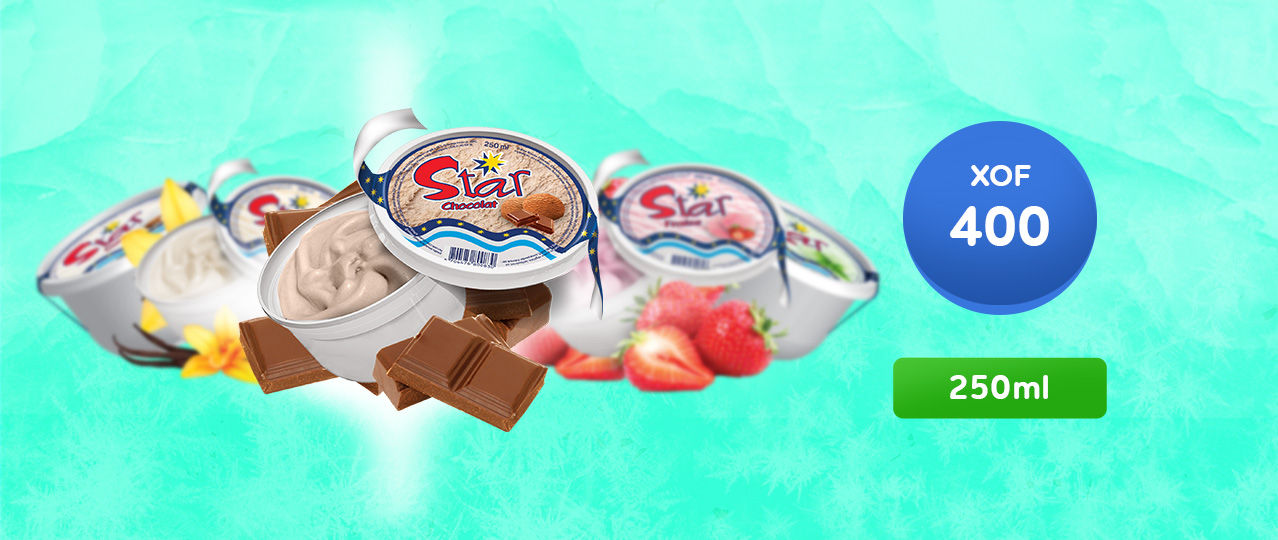 Star est une délicieuse crème glacée onctueuse et crémeuse. Elle est disponible en 5 saveurs excitantes : vanille, fraise et chocolat., coco & menthe., Et a une durée de conservation d’un an. Elle est livré dans un pot de 500 ml au prix de 750 FCFA.