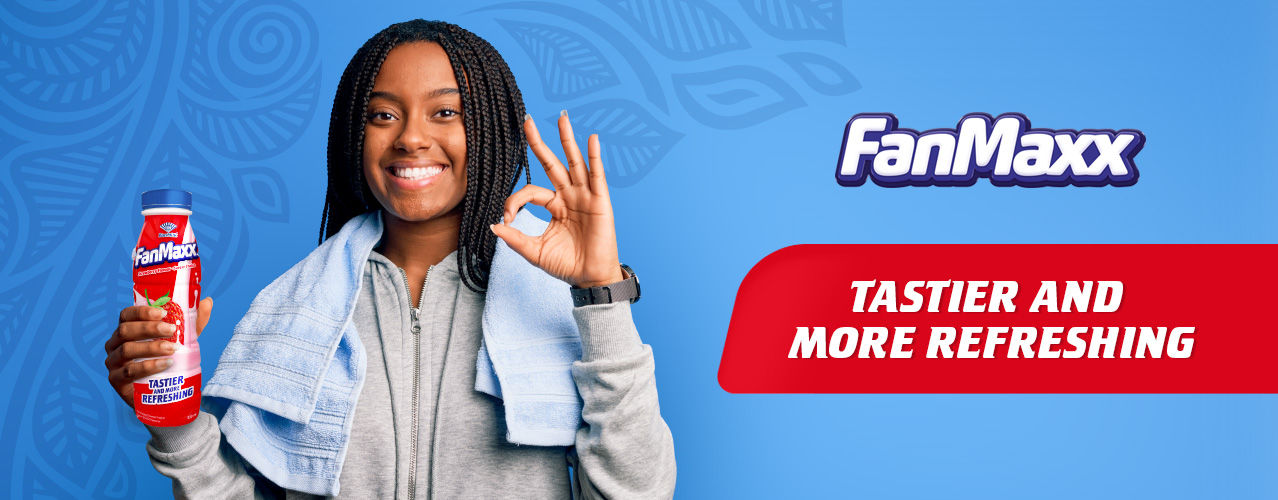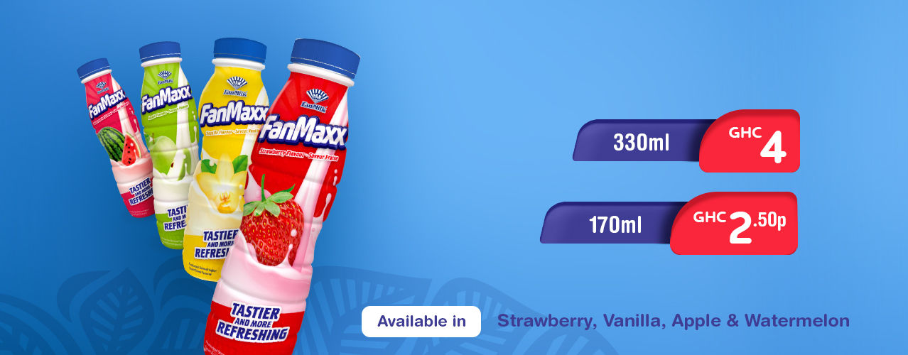 FanMaxx est un yaourt crémeux ambiant. Il est disponible en quatre saveurs: fraise, vanille, pastèque et pomme. Il est livré en packs de 330 ml et 170 ml et est au prix de GHC 4 et GHC 2,50 p respectivement. Il a une durée de conservation de 4 mois.