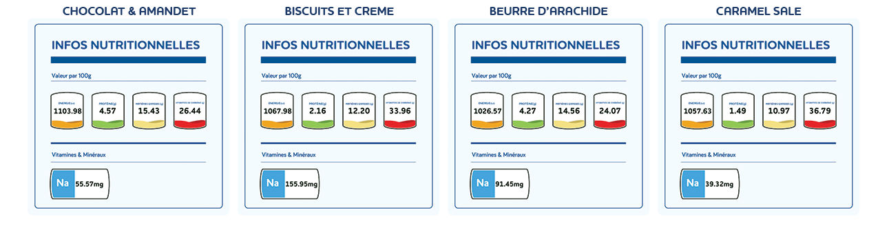 Biscuits et crème, chocolat amande, beurre d'arachide et caramel salé. Il est disponible en formats de 320 ml à GHC17 et a une durée de conservation de 6 mois.