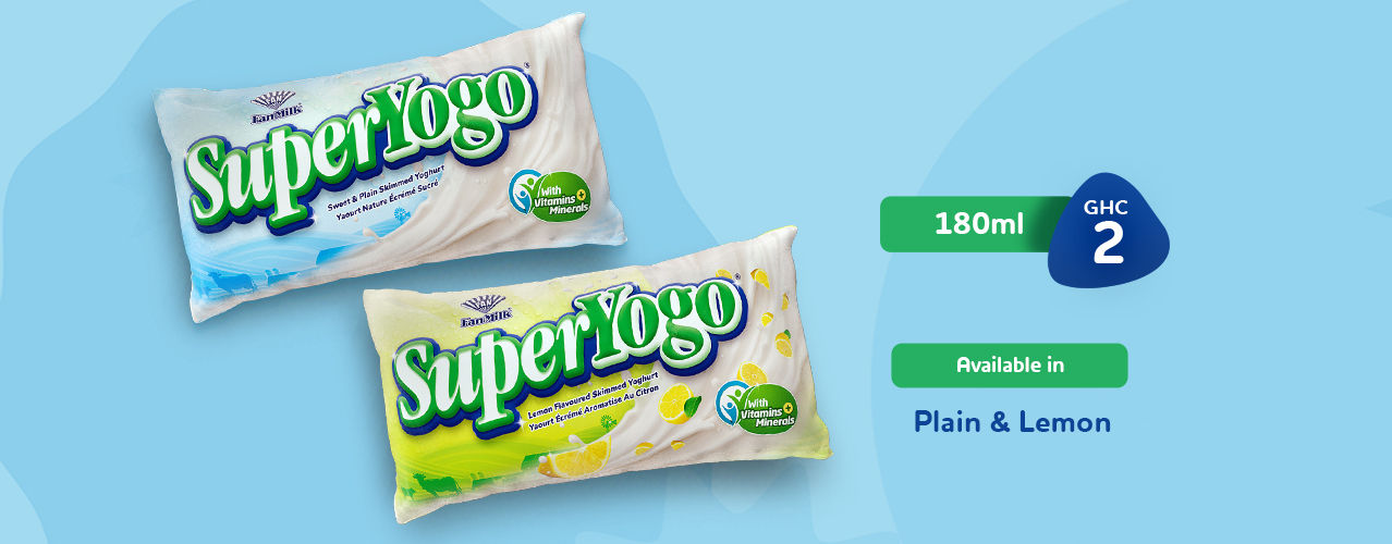 SuperYogo est un yaourt glacé enrichi. Il existe en deux variantes - nature et citron - et contient des nutriments essentiels tels que la vitamine B2 et B6, le calcium, l'iode et le phosphore. Il est disponible en volume de 180 ml et au prix de at GHC 2. Il a une durée de conservation de 6 mois.onsumer Engagements