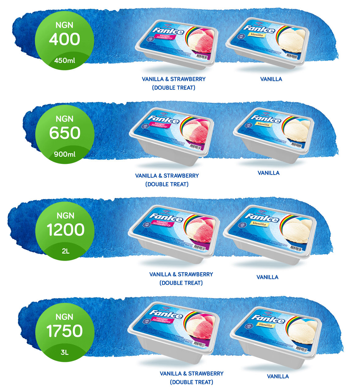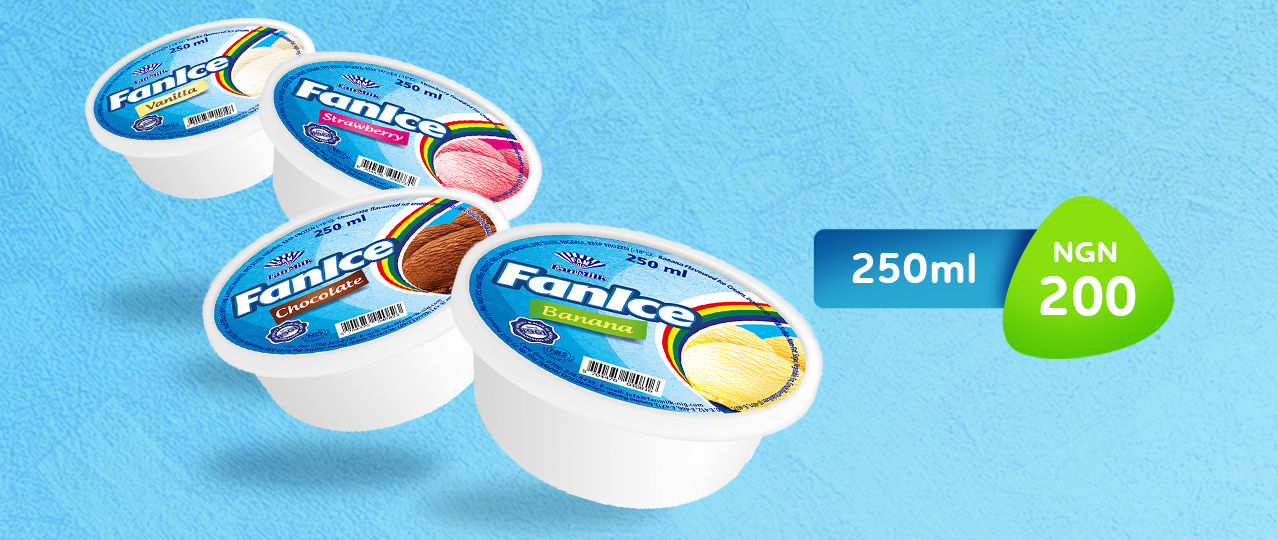 FanIce est la marque n ° 1 de crème glacée au Nigeria et ravit les consommateurs avec une expérience unique, crémeuse et satisfaisante de la crème glacée depuis plus de 50 ans. Fabriqué avec des ingrédients fins, FanIce se décline en quatre variantes passionnantes; Vanille, fraise, banane et chocolat. Il est disponible dans tous les grands supermarchés et magasins près de chez vous. FanIce - FanIce est la première marque de crème glacée du Nigéria faite avec des ingrédients fins pour un goût crémeux et satisfaisant unique. Il se décline en quatre variantes passionnantes; Vanille, fraise, banane et chocolat et est disponible en 120 ml, 250 ml (vanille, fraise, banane et chocolat) 450 ml, 900 ml, 2 litres et 3 litres (vanille et double festin). Cela s'améliore lorsque vous suivez @Faniceng sur toutes les plateformes sociales.