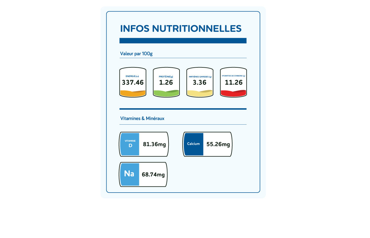 Eau, sucre, Extrait sec dégraissé de lait, amidon, emulsifiants/stabilisants (E401,407,E412,E471), matière grasse végétale, arôme vanille, édulcorants (E950,E952,E954)