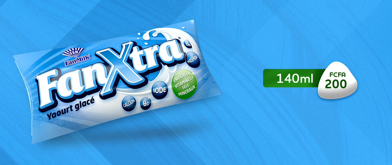 FanXtra est un yaourt glacé nutritif riche en vitamines et sels minéraux. Il est livré dans un emballage de 140ml et au prix de 200 FCFA. Il a une durée de vie de 6mois.