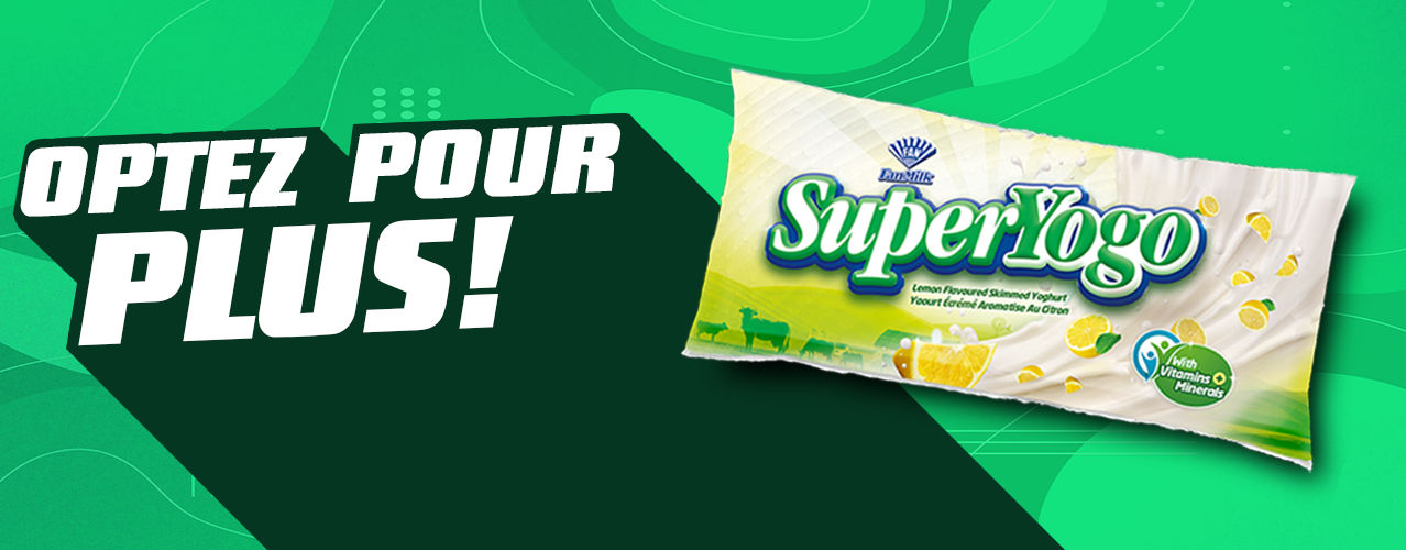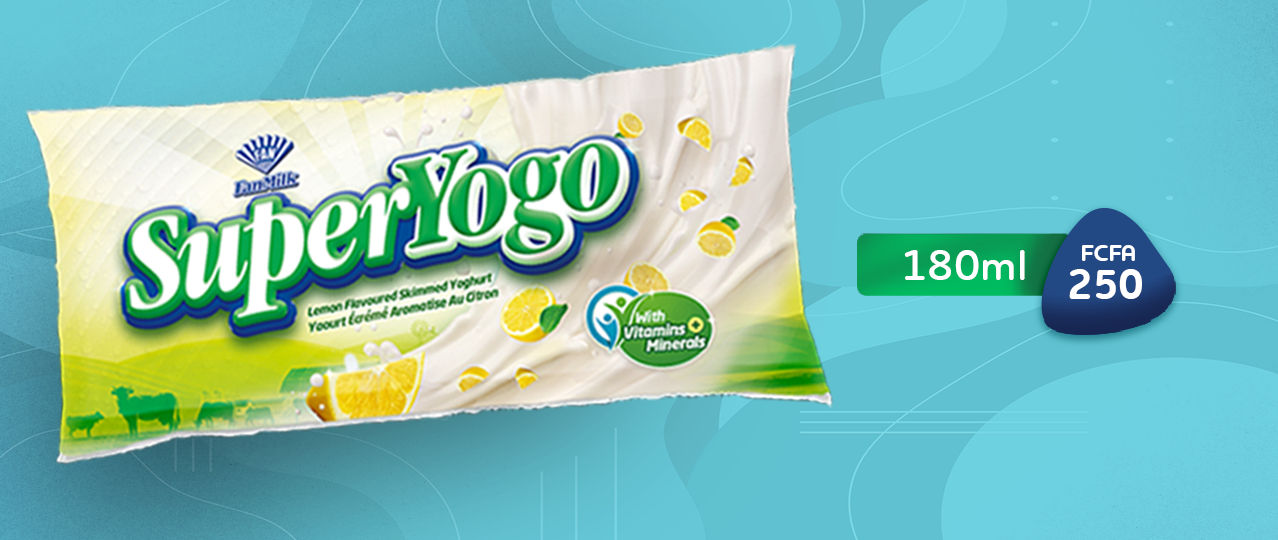 SuperYogo est un yaourt fortifié surgelé . Il existe en citron et il contient des nutriments essentiels comme la vitamine B2 et B6, le calcium, l'iode et le phosphore. Disponible au format de 180 ml et coûte at 250 FCFA, sa durée de conservation est de 6 mois.