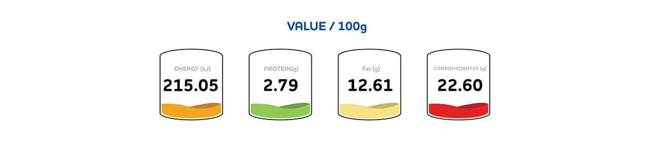 pure filtered water, sugar, milk powder, vegetable fat, chocolate chips, emulsifiers/stabilizers (E471, E412, E466, E407, E304, E307), flavor, colours (E102, E110), vanilla artificial flavour.