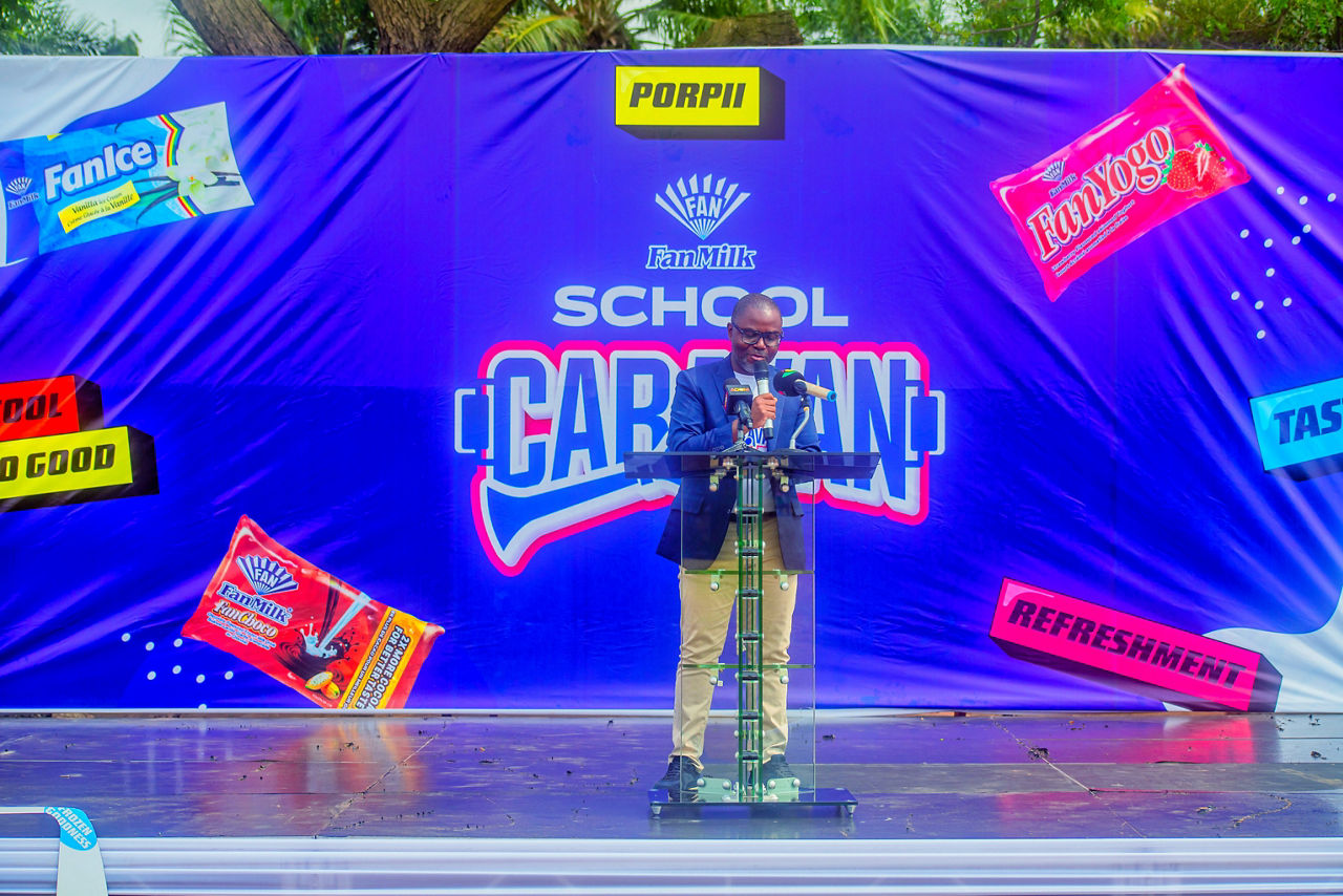 Lionel Parent, the Managing Director of FanMilk Ghana and Francos, speaking at the FanMilk School Caravan event.