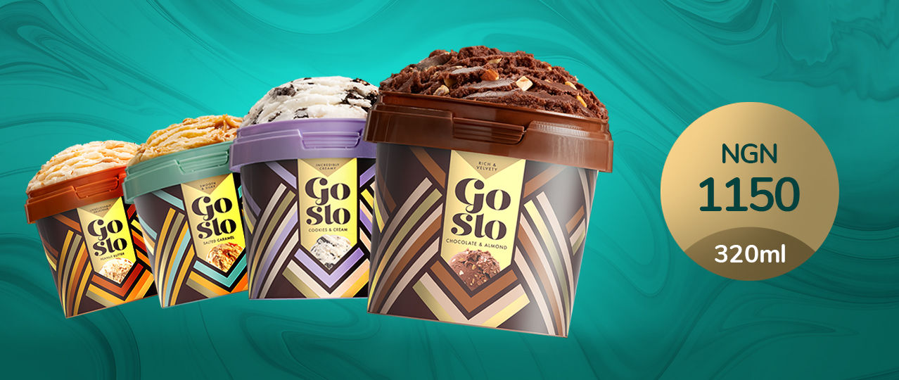 GoSlo is Nigeria’s first locally produced premium Ice-cream brand. It is available in 4 exciting flavours: Cookies and Cream, Chocolate almond, Peanut butter and Salted caramel. GoSlo comes in 320ml and has a 6-month shelf life.